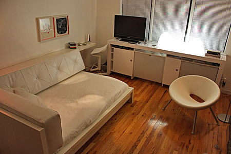 O apê: studiozinho clean, com cama facilmente disfarçada de sofá. 2 andares de escada. 180 dólares.