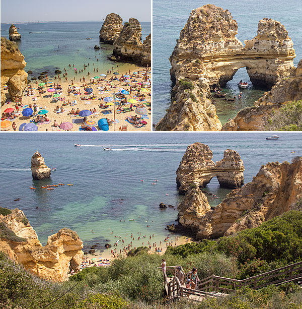 Para lá da Ponta da Piedade, Lagos tem outras duas praias bastante freqüentadas: Porto de Mós e Praia da Luz. Tanto uma quanto a outra são urbanas (a Luz, mais urbana que Porto de Mós), têm faixa larga de areia, bares e aluguel de espreguiçadeiras. As falésias aqui apenas enfeitam os cantos: o acesso é direto, não precisa descer (ou subir) escadarias. Eu acho que ambas perdem para Dona Ana — mas, se você quiser conferir, aqui vão as coordenadas.