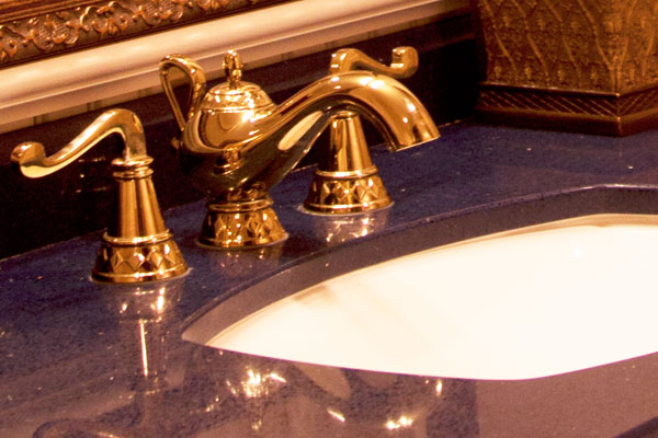 Outras peças do cômodo (como o porta-toalhas ou o porta-papel higiênico) também contam com os toques de dourado que fazem tudo parecer como o interior da “casa” do Gênio.