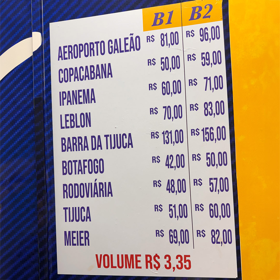 - Barra da Tijuca: R$ 123 a R$ 155 (R$ 146 a R$ 185 na bandeira 2)