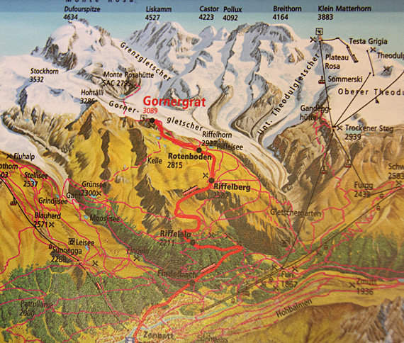 São 35 minutos até o Gornergrat, que fica a 3.100m de altitude (você pode acompanhar pelo mapa impresso na mesinha do trem — esse mesmo que fotografei).
