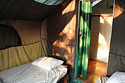 As barracas são arejadas (e se você vier no meio do ano, durante a seca, vai precisar se cobrir à noite). Todas são “suítes” — isto é, têm toalete e pia próprios. Cadeirinhas de diretor transformam a frente numa varanda. Um varal está conveniente armado nos fundos. Os banheiros de tomar banho são amplos e têm vários chuveiros privativos — não rolou fila em nenhum dos dias da minha estada.