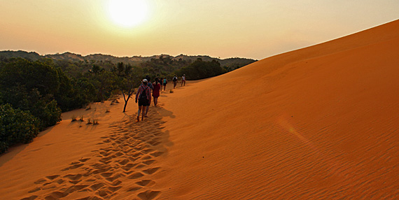 A duna fica a uma hora e pouco de viagem do acampamento; o caminhão chega na hora mais propícia para subir sem muito esforço e fotografar os efeitos do pôr do sol na lagoa. Como expliquei aqui, a duna é resultado da erosão de uma das faces da Serra do Espírito Santo.