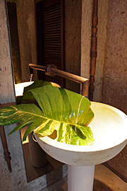 Os guardanapos e toalhas de linho não são passados a ferro — são postos à mesa charmosamente amarfanhados. A água das piscinas dos bangalôs é marinha. Não se usa plástico em lugar nenhum nem embalagens individuais de papel. (O adoçante vem à mesa num lindo conta-gotas usado em laboratório de química.) Peças rústicas de vários continentes — muita coisa vinda da África — misturam-se pelos ambientes, sem que você consiga identificar a origem (poderiam muito bem ser daqui).