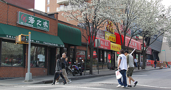 Você vai descer no fim da linha. Emergindo do metrô você vai dar num cruzamento que poderia estar em Taipé. (A grande colônia local é de Taiwan.) Procure a Prince St., que é a paralela de trás da Main St. Essa é a rua dos bons restaurantes de Flushing.